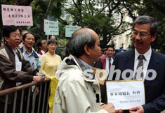 香港制造业总工会与饮食业总工会代表,十二月十八日在香港特区政府总部,向保安局常务秘书长汤显明递交支持《基本法》第二十三条立法的意见书。潘索菲 摄