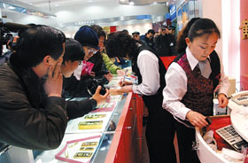 在北京菜百商场,长龙般的队伍一直在排队购买小金条,商场售货人员也认为货估计很快就会销售一空。而菜百公司独家推出的“羊年贺岁”金条是所有购买者的关注热点,顾客的购买金额最高达到了10万元,这也是北京地区惟一能够买到“羊年贺岁”金条的商场。