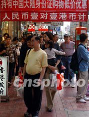 圣诞来临,香港商家屡出高招揽内地客生意,图为铜锣湾附近的商家打出人民币与港币等值的消费标语以吸引内地客消费。潘索菲 摄