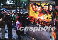 由张艺谋执导的武侠巨片《英雄》二十日在福州上映。影片开映前,电影院门口排起了长长的购票队伍。作者:郑祚声