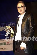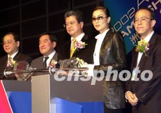 歌影红星郑秀文12月21日在香港出席“2002年亚洲游戏展”,与多家著名的游戏生产商代表一同主持开幕典礼。中新社传真 邓庆乐 摄