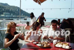香港南丫岛周末游客众多,初来乍到的外国游客兴致勃勃地在海边品尝地道的蒸笼点心。中新社传真 洪少葵 摄