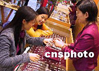 两名年轻女性前来到福州新开张的马来西亚益安珠宝金饰专卖店,为新年挑选心爱的新款首饰。中国十二月黄金市道开始大为看好。刘可耕 摄