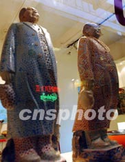 十二月二十六日,在香港街头一家雕塑艺术店的橱窗里,摆放着两尊风格别样的毛泽东艺术像。中新社传真 钱兴强 摄