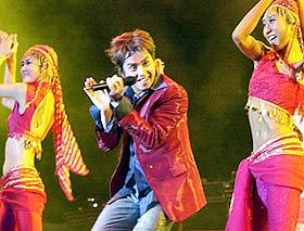 只见阿伦一身金色的服装,再次出现在观众面前。而歌迷也开始离席,跑到观众席的最前排,不一会儿,整百位歌迷就在台前随着音乐起舞。