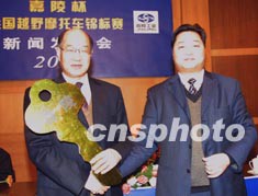 由嘉陵集团提供专用赛车的2003年“嘉陵杯”全国越野摩托车锦标赛,将于明年4月在北京、重庆等地举行。图为嘉陵集团总经理李华光(右)岁末向汽摩中心主任石天曙赠送赛车钥匙。作者:赵振清