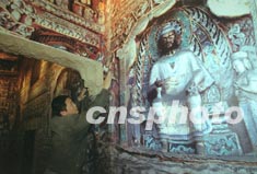 包括大同云岗石窟在内的中国二十八处世界自然、文化遗产复制品岁末将在北京集中展出,以纪念《世界遗产公约》签订三十周年。图为工作人员在云岗石窟展区作最后的布置。作者:张勤