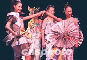 解放军某部女兵岁末走上舞台,精心演绎用旧报纸、床单、沙巾等制成的别致时装,释放爱美心绪。作者:宋吉河