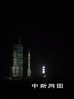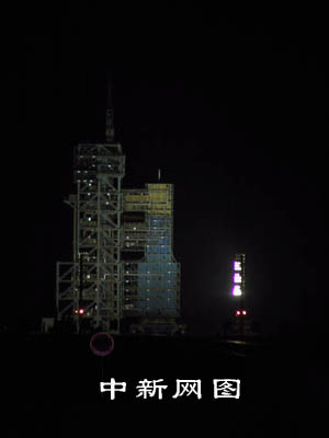 发射前十五分钟,发射塔架旋转平台完全打开,“神箭”托举着“神舟”蓄势待发。 中新社记者 孙自法 摄
