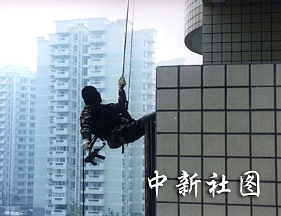 26日,成都首次反恐怖演习。在处置恐怖分子对某跨国公司办公大楼实施的劫持人质的演习中,特警秘密潜入大楼,准备伺机行动。作者:刘真