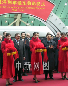 三十一日,世界第一条磁浮商业示范运营线——上海磁浮列车线在沪通车,中国总理朱镕基与德国总理施罗德参加通车典礼并试乘了首发列车。图为中德两国总理在龙阳路车站为上海磁浮列车通车剪彩。中新社 王健 摄