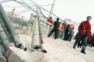 中新网1月3日电 昨天凌晨5时许,一辆加长货车路过广州市广园西路王圣堂与京广铁路交汇处时,不慎挂上空中铺设的民用电缆,拉断四根用于架设电缆的水泥杆,导致近300米电缆垂落在地。因抢修该电缆造成京广线广州段中断一个多小时,其中有一段电缆险些碰上京广铁路2.7万伏铁路专用高压电网。