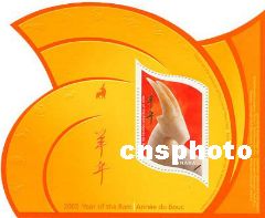 由温哥华华裔美术家设计的这枚邮票,票面是鲜红背景下衬托的一只金色公羊头像,造型压纹,质地如丝,充满中国传统新年的喜庆色彩。邮票左下方写有中文草书“羊年”,旁边还有“羊年”的英法两种文字。