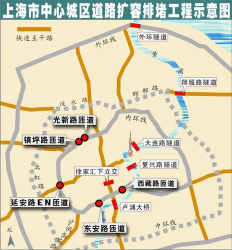 此外,西藏路、长宁路、周家嘴路等一批中心城区道路都列入了各有关区政府的扩容排堵重点实施项目,年内都将完成拓宽改建施工。镇宁路、清真路等一批道路打通瓶颈堵头工程将同步实施。南北高架部分地面道路、肇嘉浜路、徐家汇路部分路段的机动车专用通道改建项目也将在年内完成。