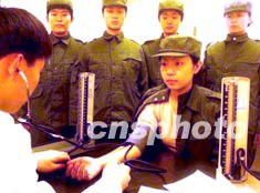 北京解放军某部八日对新兵进行身体复查,不合格者退回原籍。解放军部队每年都要对新入伍的战士按照体格标准进行全面复查身体,以确保士兵体格健壮。作者:宋吉河