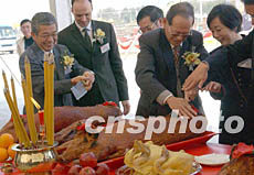 九广铁路公司落马洲支线动土仪式一月九日在香港落马洲举行,该支线全长7.4公里,由上水站向西北伸延经古洞、洲头至落马洲车站 。图为众官员在仪式上拜神。钱兴强 摄