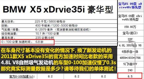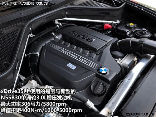 下面就说到我们的重点了,此次2011款宝马X5xDrive35i车型在发动机上采用了型号为N55B30的单涡轮增压发动机,这套发动机系统也是宝马最新研发出来的,之前在国内的车型上仅有5系GT车型使用。特别需要说明的是这款发动机在搭配在车辆上后使得2011款宝马X5的百公里加速仅需6.8S,仅比老款的4.8L V8发动机版的车系慢0.3S,但究竟实际加速度是多少呢?还要等我们的单独测试后才知道。