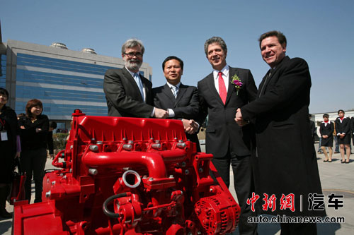 美国康明斯公司总裁龙跃伟、福田汽车总经理王金玉、康明斯新兴市场和业务部总裁曹思德、康明斯(中国)董事长兼首席执行官华金生在即将投产的康明斯发动机前合影