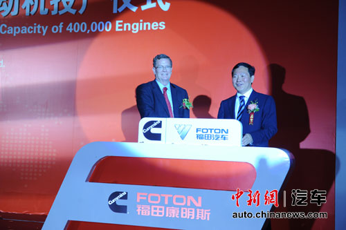 美国康明斯公司董事长兼首席执行官苏志强先生和福田汽车总经理、福田康明斯公司董事长王金玉先生共同启动福田康明斯公司40万台发动机产品投产仪式装置