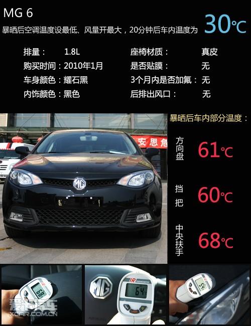 内外通黑没有贴膜的MG6车身温度达到54摄氏度,门把手微烫,开启空调后车内降温速度没有想象的迅速,要是有后排出风口车内温度下降应该会更加均匀。