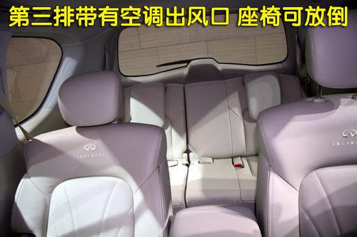 接下来我们就要说到第三排座椅了,也许这里的使用次数并不会很多,但是英菲尼迪同样为第三排乘客提供了空调出风口,大大提高了舒适度,如果有人故意将我挤到最后面的话,我想我还是可以接受的。如果当你需要更大的空间作为储物用途时,第三排座椅可以进行4/6拆分放倒,这一点你要相信它的实力。总之如果你需要一些个性,又想兼顾品质与豪华舒适,这款英菲尼迪全新QX56应该会很贴合你的想法。