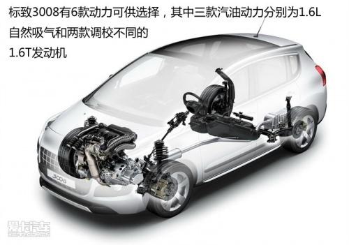 标致3008有6款动力可供选择,包括三款柴油动力和三款汽油动力,首先来说与国内消费者关系最密切的汽油发动机,包括一台1.6升VTi发动机,最大功率118马力,扭矩160Nm;另一台1.6升THP涡轮增压发动机最大功率148马力,扭矩374Nm,另一台高功率的1.6升THP涡轮增压发动机最大功率154马力,扭矩374Nm。