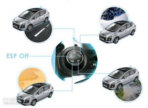 标致3008还有一个值得一提的功能就是抓地力控制系统;其由一个先进的牵引力控制系统和特殊的泥/雪轮胎,通过自动调节前轮的牵引力输出方式和功率来达到对应的效率。标致的这套系统通过人工来进行切换,其一共有五个控制档位:标准、雪地、越野(泥地、烂路、湿滑草地)、沙石地和关闭;通过调节不同的档位来适应不同的路面情况。