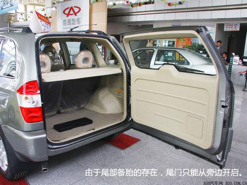 瑞虎的整体造型更偏重时尚,U型镀铬进气格栅,气势比较平和,显得比较秀气;车身侧面的时尚车贴,加强了几分动感;而挂在车门上的备胎才能真正的透露出瑞虎的一丝野性,不过由于备胎的存在,尾门只能从旁边开启。