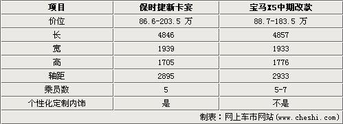 保时捷新卡宴是保时捷推出的换代车型,在外形的改变、内饰的改变还有动力系统的改变上都非常的多。而BMW X5属于第二代X5的中期改款车型,因此在外形的改变上并不十分明显,依然保留了很多第二代X5的经典元素。