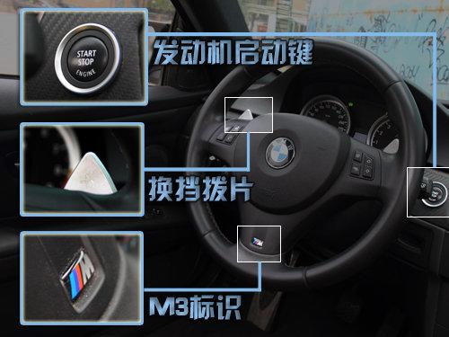 方向盘后则可以看到无钥匙启动按钮,M3方向盘采用小尺寸三幅样式,皮制包裹的触感很棒,两旁侧翼设计有功能按键,使用起来安全又方便,下翼底端深深嵌入的M3标志给予再次身份的提醒。换档拨片的加入对于崇尚性能的车型来说是必不可少的,在降档瞬间车身猛地弹出去时,又有多少人会舍得把手从这诱人的方向盘上挪开呢?