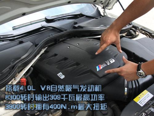 看完了外观和内饰,M3透露出来的“伪”气质似乎比较隐蔽,影影绰绰。现在咱们看看动力的部分。M3搭载4.0L V8自然吸气发动机,应用Valvetronic (电子气门技术)、DME数字式电子伺控系统、双凸轮轴可变气门正时控制系统 (Bi-VANOS)等电子控制技术,8300转时输出309千瓦最高功率,3900转时拥有400N.m最大扭矩。爆裂的孤狼性格此刻终于暴露了。