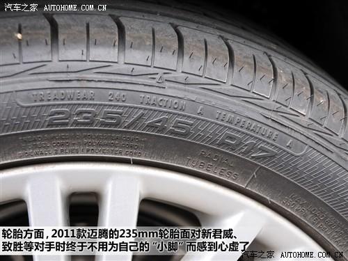2011款迈腾有一项对性能影响很大的配置变化需要我们注意:2.0T的舒适型和豪华型换成了17寸的轮毂和235/45 R17的固特异单导向轮胎,相比之前215/55 R16的轮胎,直径尺寸大了一个级别,宽度也增加了两个级别,对性能的提升效果是非常明显的,尽管有可能加速性能会稍差一些,但操控性和稳定性会大幅攀升。