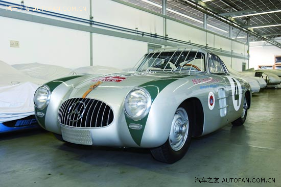 这辆前风挡安有栅栏的300SL,参加过50年代1600公里不停歇的泛美拉力赛,栅栏是为了阻挡老鹰装碎风挡。它出门参展的时候,保险额度达到300万欧元。全球目前共有5辆,3辆在这个仓库里。