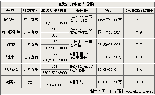 我们看到上述6款车中,有5款发动机是采用缸内直喷技术,三款采用了双离合变速器,只有来自自主的瑞麒G5要逊色很多,不过价格方面的优势是明显的。在功率、扭矩方面,新君威优势明显,体现在0-100Km/h加速上也是仅7.7秒,与年底上市的沃尔沃S60相当。而蒙迪欧致胜考虑到沃尔沃与福特的关系,至少从参数上看与S60的2.0T发动机很可能是同一款。