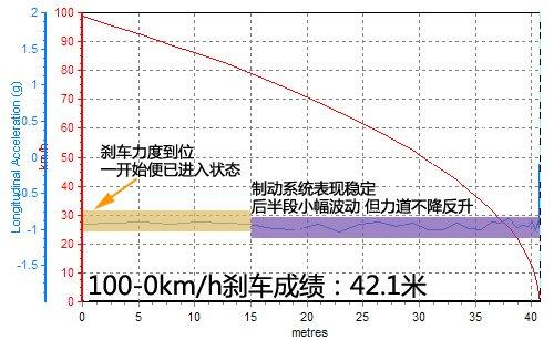 受到轮胎温度、系统状态等多方面因素影响,第一次测试成绩超过了43米,不过之后宝来迅速进入状态,连续的高强度测试下没有出现热衰减现象,表现一直稳定,尤其是卡钳的制动力度能维持在较高水平。