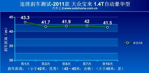 大众的刹车系统一直保持着不错的传统,成绩不算特别突出,表现会比较稳定,宝来1.4T的刹车表现也是如此,42.1米的成绩不算优异,但也令人满意。