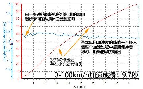 由于双离合变速箱的自我保护程序以及轮胎打滑的影响,起步瞬间车辆的加速度并不像想象的那么高,好在之后发动机的输出一直很流畅,全油门状态下变速箱会把升挡时机延迟到7000转以后,整个冲刺过程没有太大的波澜,9.7秒的成绩在紧凑家用车当中已属上乘,而按排量算起来更是没有太多竞争对手。