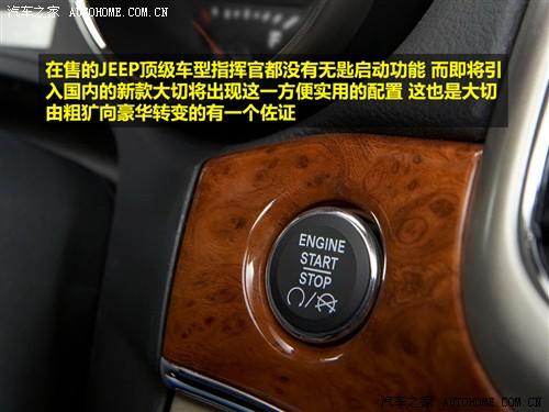 在转向柱附近我们看到了无匙启动按钮,目前在售的JEEP顶级车型指挥官都没有此功能,也许是为了追求JEEP一贯的越野复古风格,而现今的2011款大切将出现无匙启动,确实是一个方便实用的配置。