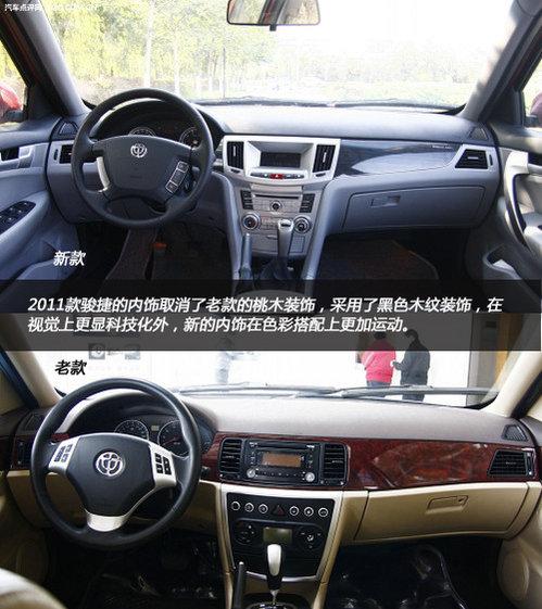 2011款骏捷的内饰取消了老款的桃木装饰,采用了黑色木纹装饰,在视觉上更显科技化外,新的内饰在色彩搭配上更加运动。中控台和老款车型差异很大,采用了大量的按键设计,中控锁、后备箱开关、油箱开关集成在最上面。新款骏捷的三幅方向盘改成了四幅式设计,感觉更加稳重。