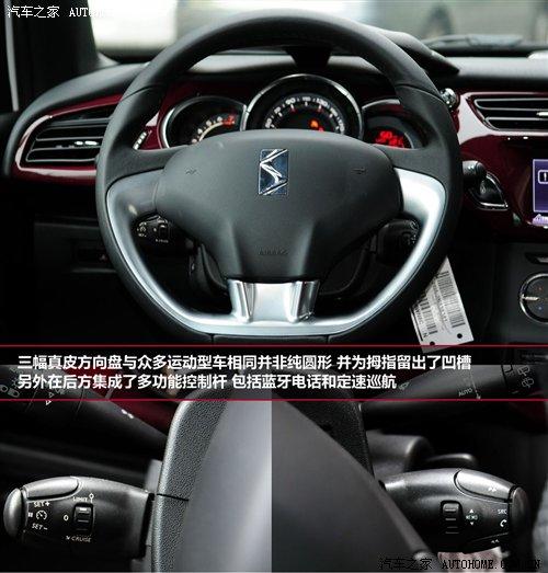 真皮三辐方向盘与众多运动型车相同,并非纯圆形,拇指处的凹槽方便握紧;多功能方向盘后面的控制杆集成了多功能按键,包含了蓝牙电话和定速巡航。