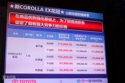7月13日,也就是长春车展的前晚,一汽丰田改款花冠EX正式上市,新车共推出五款车型,新款花冠除了外观上有明显的变化外,配置也有所提升,而起步售价在老款的基础上下调了7千元,高配车型的降价幅度更是高达1.5万元,这也使得花冠将把性价比作为自己的主要竞争力,矛头直指稳坐乘用车销量前三的悦动和新凯越。