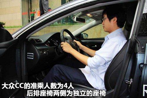 大众CC的准乘人数为4人,后排座椅两侧为独立的座椅。座椅背部以及坐垫对于身体都能够给予很好的支撑。后排头部空间略有欠缺,但后排腿部空间足够宽大。由于其Coupe车身造型的设计,乘员在进出后排空间时需要注意压低身体,略感压抑,而从体感觉还比较舒适。