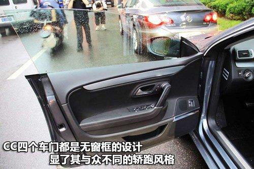 一汽-大众CC的四只车门都是无窗框的设计,这样的设计风格在国内的大多数车型中都很少见,这一点也是彰显了其与众不同的轿跑风格。在车门内部的积镀铬件和真皮面料的应用让人很容易联想到一些豪华车的设计元素,也有几分复古的感觉。