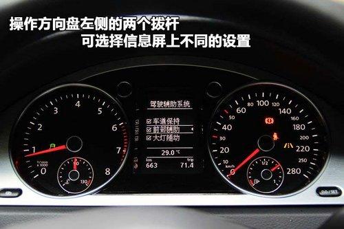 一汽-大众CC轿跑车仪表盘虽然造型设计与迈腾略有差异,但同样采用白色冷光背景,清晰易读。而在转速表和时速表中间集成了信息显示屏,通过操作方向盘左侧的两个拨杆,可以调节和选择不同的设置。