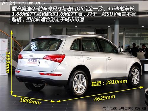 国产Q5的车身尺寸与进口Q5完全一样,长×宽×高分别为4629×1880×1653mm,轴距为2807mm。与其同级对手如宝马X3、奔驰GLK、沃尔沃XC60等车型尺寸接近。车内空间算是比较宽敞了。轮毂尺寸与进口版相比则明显缩水,四款车型的轮毂依次分别为17、18和19寸,而进口版却是全系标配了20寸的轮毂。