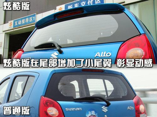 再来看看车身侧面,这里的变化就比较明显了,共有两处。不过,也都是我们可以自己动手来改变的,车门上增加一条粗狂的黑色防擦条,前端的镀铬部分由ALTO的印记。底部还假装了侧裙,让底盘拥有更明显的贴地感。