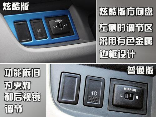 首先是方向盘左侧的多功能控制区,我们可以先看看普通版的设计,黑色和灰色的搭配虽然是比较经典的配色,但是对于奥拓这样一款充满个性的车来说,这样的配色就显得有点平淡了。炫酷版内饰第一个亮点就是将外部的颜色带到室内,让车内也有和外面遥相呼应的地方,这里的黑蓝配色不但看起来更清晰,装饰效果也大大提升。