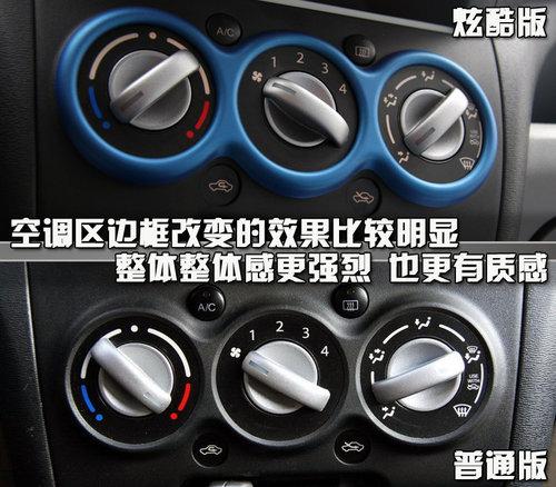 接着是中控台主操作区,有些朋友可能在中控台整体图上看到了音频区似乎发生了一些变化,不要急,我们最后再说这一项惊天的改变。首先我们先来看空调区的三个圆形旋钮,看过老款设计之后,我们可以看出三个旋钮的整体感并不强,虽然做了凹凸的设计,但是质感还是不够。炫酷版就不一样了,虽然也只是加了蓝色边框,但是完全将三个旋钮串联起来,并且十分清晰。