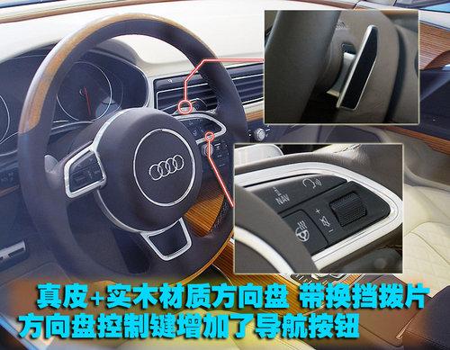 方向盘部分能够看到奥迪专为跑车化而设计的三幅运动型方向盘,通常A8的方向盘是更加舒适化的4幅方向盘。真皮缝制与实木材料的应用是奥迪为豪华车市场专门打造的。在这里我们发现了以前奥迪并未在方向盘上安装的“Nav”即导航按钮。