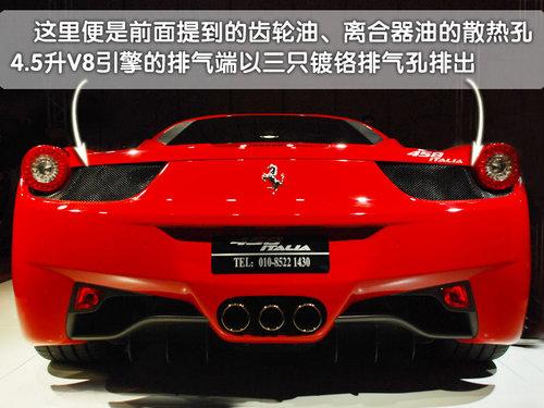 在458Italia的车尾两侧,同样分别设计有两处通风口,当气流最终达到车尾的时候458Italia的设计者再一次将气流转变为有益于齿轮油和离合器油散热的气流,从车尾将散热器的热量带走。